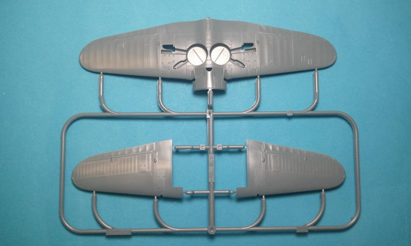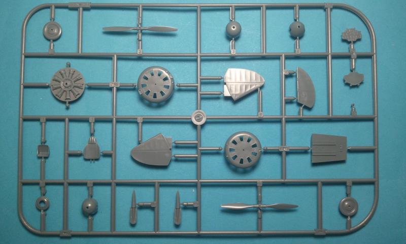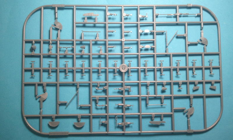 Was ist in der Box? Wie üblich vertreibt Eduard seinen Weekend-Kit in einer stabilen zweiteiligen blau-gelben Box mit ansprechender Boxart. An fünf Rahmen finden sich 91 blaugraue Teile sauber abgespritzt mit wenig Grat und ohne nennenswerte Auswerfermarkierungen oder Sinkstellen. Ein kleiner Klarsicht-Rahmen enthält eine Windschutzscheibe und ein Reflexvisier. Die Oberflächen sind durch feine Gravuren, erhabene Details und einige Nieten dargestellt, auch die Stoffbespannungen sind glaubwürdig nachgebildet.