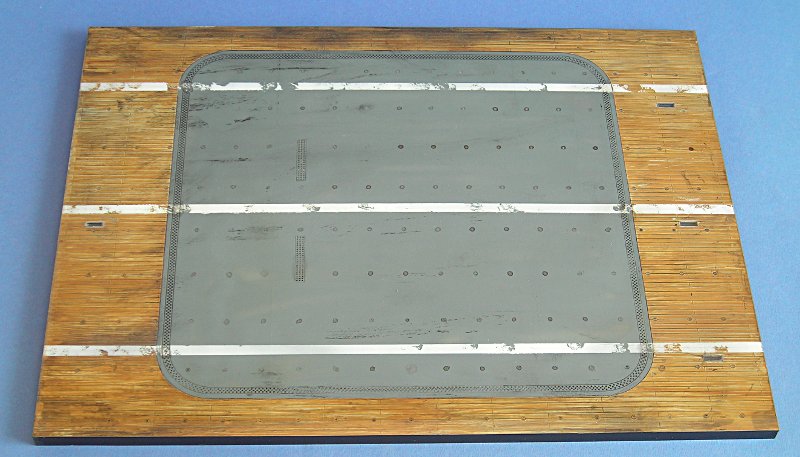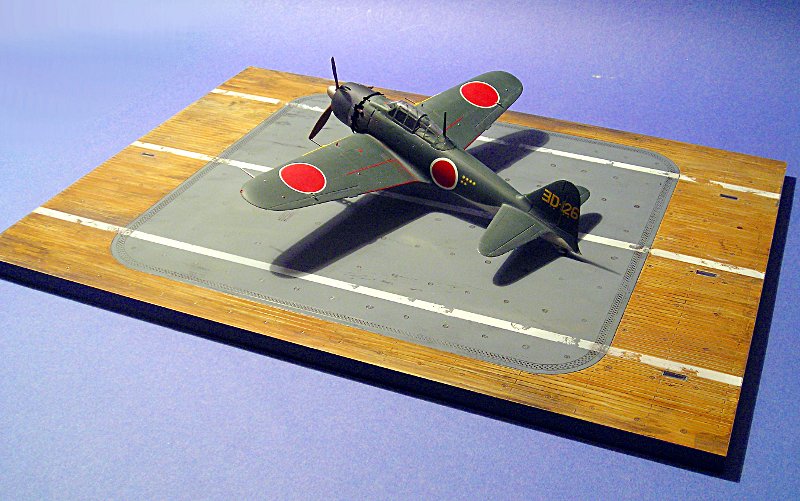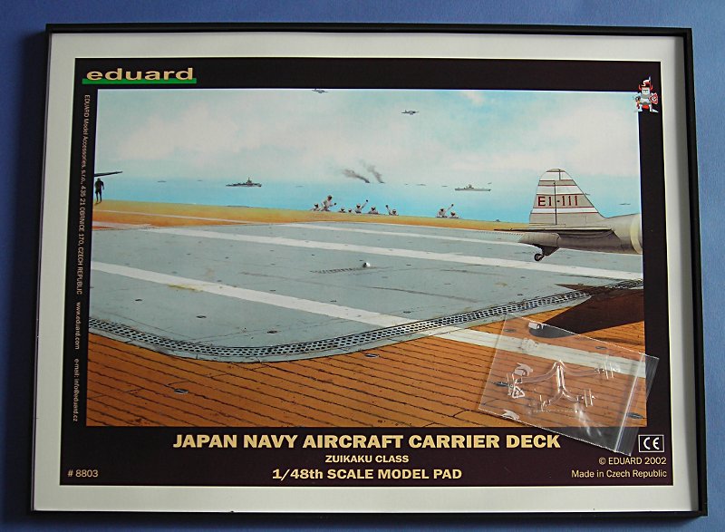 Diesen Monat bringt Edurad dieses Bauteil aus dem Jahre 2001 (bzw. 2002) wieder auf den Markt. Mit diesem kann man auf einfache Weise alle Japanischen Trägerflugzeuge in Szene setzen, sei es für die Heimische Vitrine oder auf einer Modellbauausstellung. Die Plastiktüte enthält das ca. A3 große Deck aus schwarzem Plastikmaterial und einen kleinen klaren Spritzling mit 4 Oberlichtern. Das Deck hat einige Spritzspuren, die aber nach der Bemalung nicht mehr zu sehen sind (insbesondere wenn ein Flugzeug drauf steht.