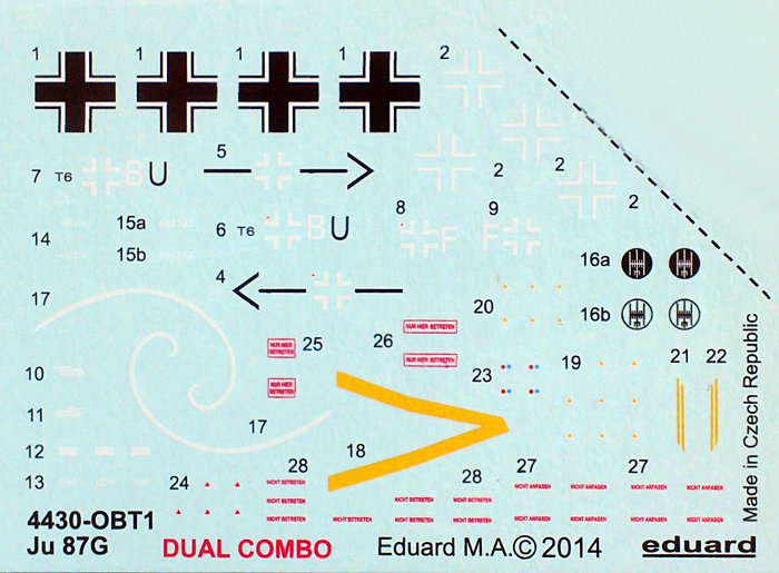 Die Decals:Sauber gedruckte Decals im üblichen Standard. Drei verschiedene Möglichkeiten für eine Ausführung der Deutschen Luftwaffe aus dem 2. Weltkrieg. Bei Details und Stencils hält sich der Hersteller allerdings etwas zurück.