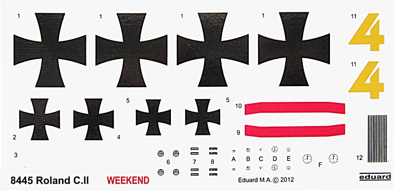 Es ist eine Bemalungsvariante für eine Roland C.II an der Werstfront 1917 enthalten. Wie schon erwähnt ist der violette Farbton falsch (oder zumindest extrem unwahrscheinlich) und sollte durch Rotbraun ersetzt werden. Die Produktion der Roland C.II endete im Frühjahr 1917 und das Pflaumenblau wurde gegen Ende 1917 eingeführt. Als Bemalungsnleitung dient der Kartonboden.