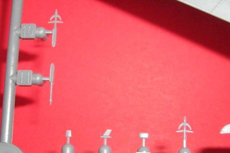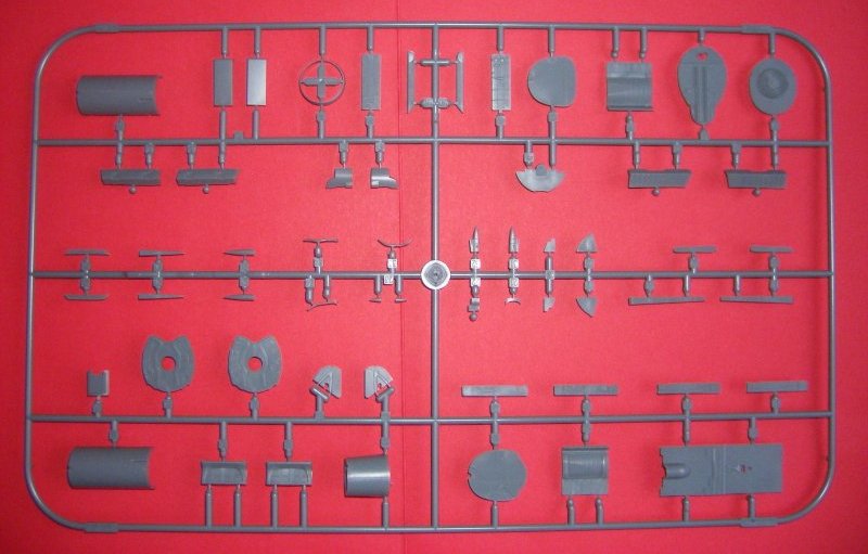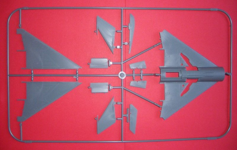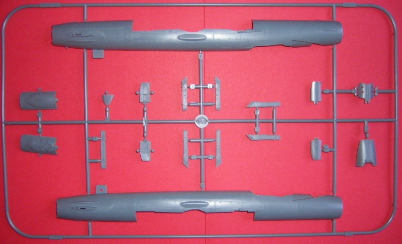 Nun zu den Großteilen. Alle zeichnen sich durch feine Oberflächengravuren aus. Bei den Tragflächen fällt die ungewohnte Aufteilung ins Auge. Seitenleitwerk mit dem Bis-typischen Rückentunnel, Antennen und andere Details machen einen stimmigen Eindruck. Die schlanke runde Rumpfform des Originals kommt gut rüber, allerdings hat eduard den von der MF abweichenden Bugbereich (siehe eduardinfo) nicht in ein neues Bauteil umgesetzt – schade.