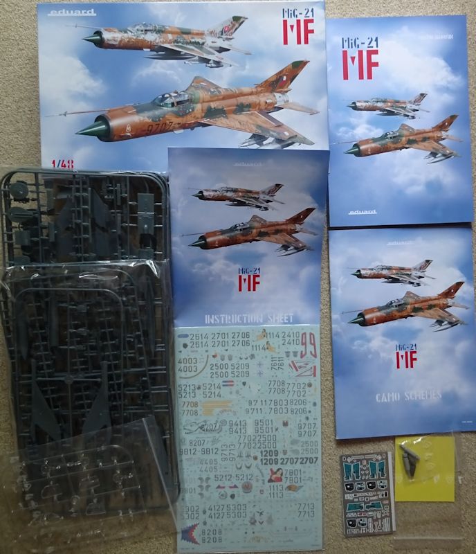 Bemalungsvarianten: Es ist die mitllerweile dritte Ausgabe die sich Schwerpunktmäßig mit tschechischen und slowakischen MiG-21 beschäftigt. Dazu gibt es ein 128 seitiges Buch in dem jede baubare Variante mit Fotos und Profiles vorgestellt wird. Eduard bietet Decals für sage und schreibe 39 Maschinen. Davon gehören 18 M/MF zu den LSK der CSSR, 15 M/MF/MFN der Tschechischen Republik und 8 M/MF zur Slowakei. Die ,otwendigen Decals findet man auf zwei von Cartograf gedruckten A4-Bögen. Für die wartungshinweise gibt es ein Extrablatt.
