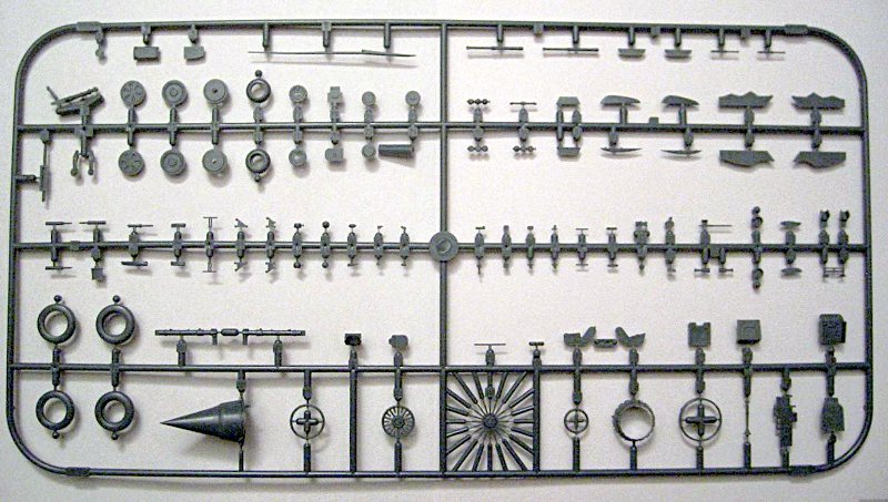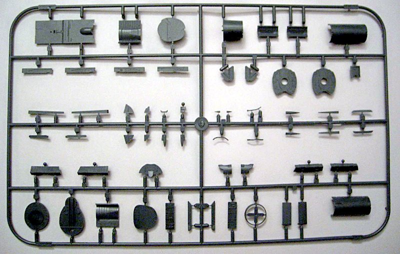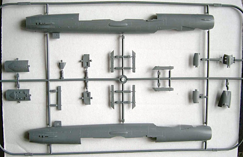 Nun zu den Großteilen. Alle zeichnen sich durch feine Oberflächengravuren aus. Bei den Tragflächen fällt die ungewohnte Aufteilung ins Auge. Ebenso irritiert der fehlende und nachzugravierende Tankdeckel. Aber nicht nur hier hat Eduard bereits an die Nachfolgemuster gedacht. Das Seitenleitwerk macht einen stimmigen Eindruck. Alle Klappen und Ruder liegen als Extrateil bei. Die schlanke runde Rumpfform des Originals kommt gut rüber. Man behebt damit die Schwachpunkte von OEZ (der Bug ist zu schmal) und von Academy (zu voluminös – A. eierte hier etwas). Einige Teile liegen doppelt bei mit der Option der geschlossenen oder geöffneten Darstellung.