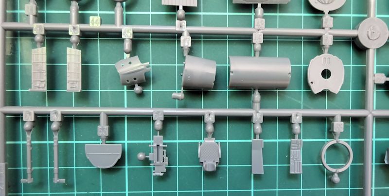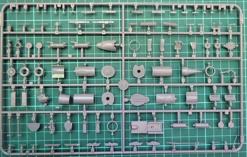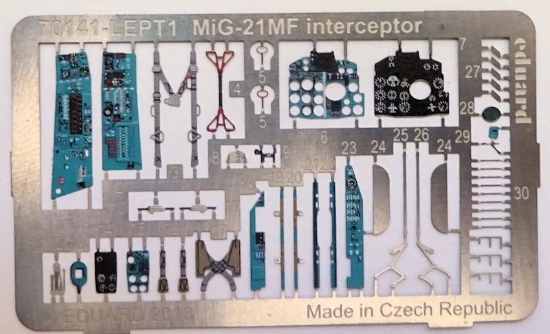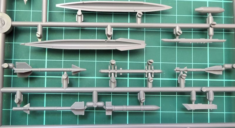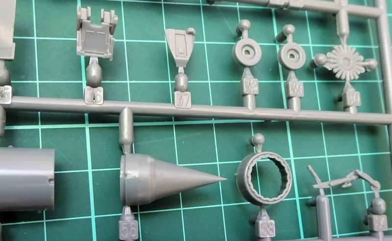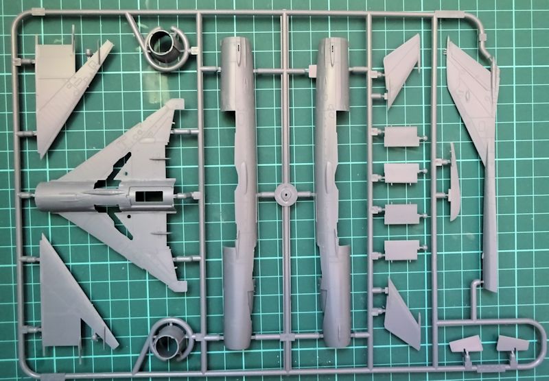 Das Cockpit besteht aus ca. 13 Teilen und kann sowohl konventionell als auch mit bedruckten Ätzteilen gestaltet werden. Das Instrumentenbrett ist exakt eine MF. Der Schleudersitz schrumpfte zwar auf drei Teile ist aber inclusiv der Ätzteile für diesen Maßstab ausreichend detailliert. Im Fahrwerkbereich ergibt sich ein ähnliches Bild: weniger Teile aber hohe Qualität. Das Triebwerk bietet alles an Details notwendige für diese Größe.