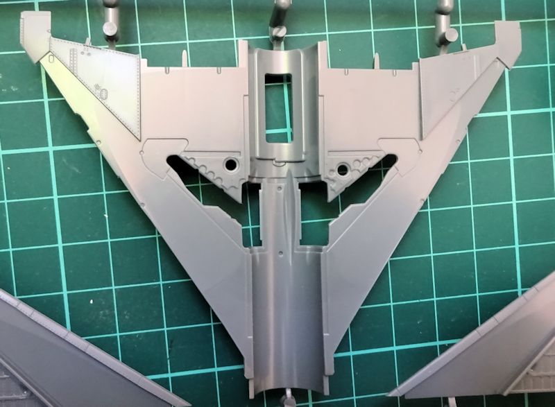 Nun zu den Großteilen. Alle zeichnen sich durch feine Oberflächengravuren aus. Bei den Tragflächen fällt die Abweichung von der vom 48er Modell bekannten Aufteilung ins Auge. Während sich mir der Sinn der Aussparung bei den Teilen 17/18 noch nicht erschließt, ist die Neugestaltung der Vorderkante eine super Idee und damit besser gelöst als bei der großen MiG. Die Kopplung der Landescheinwerfer mit den Druckbehältern in einem Klarsichteil, ist auch zu begrüßen. Obwohl die Gravuren verbessert wurden, irritiert mich der fehlende Tankdeckel für den es weder ein Decal/Ätzteil noch eine Gravurhilfe gibt.