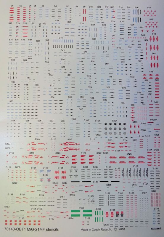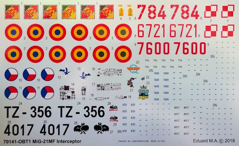 Bemalungsvarianten: Für die Bemalungsvarianten wählte eduard eine hauseigene Nomenklatur und trennte die MiG-21 nach ihren Herstellerwerken Gorki und Moskau in Abfangjäger und Jagdbomber. In der Bauanleitung werden fünf farbig gedruckte Dekomöglichkeiten angeboten, die durch zwei Seiten für die Wartungshinweise ergänzt werden. Bei diesen ist aber zu beachten, dass sich ihre Anzahl im Laufe der Einsatzzeit am Flugzeug verringerte.