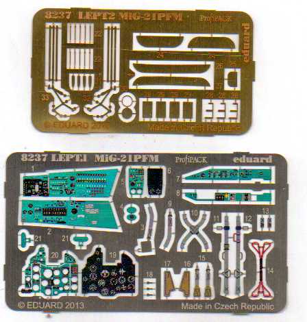 Bausatz: Eduard setzt konsequent seine MiG-21 Serie mit der zweiten Hauptversion fort. Der Kasten ist mit gut verpackten sieben grauen und einem Klarsichtrahmen mit ca. 330 Teilen (von denen für die PFM nur ca. 2/3 gebraucht werden), zwei Platinen (für Triebwerk und Cockpit) und zwei großen Decalbögen randvoll gefüllt. Neu sind die drei Rahmen (L, M, N).