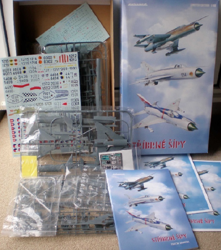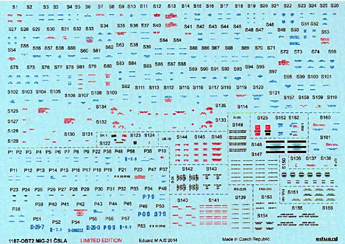 Bemalungsvarianten:Die gewohnt gute Bauanleitung umfasst 36 Seiten. Für die 32 Decomöglichkeiten gibt es ein eigenes Heft. Die Sonderedition ist wohl auf den tschechischen Markt ausgerichtet, denn es können ausschließlich tschechische oder slowakische MiG-21 gebaut werden. Jede der Baumöglichkeiten wird in einem gesonderten Heft von Martin Janousek ausführlich mit Fotos dokumentiert. Die Decals für das Cockpit sind nicht mehr grün unterlegt, so dass keine farbliche Differenz zum selbstgemischten Cockpitgrün entstehen kann.