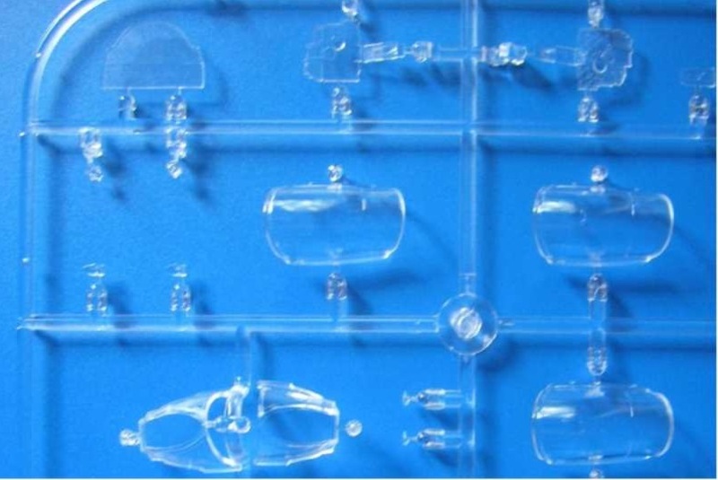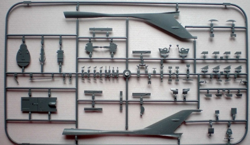 Zu deren Bau gibt es gut verpackte fünf graue und einem Klarsichtrahmen mit ca. 200 Teilen, zwei Platinen (für Fahrwerk und Cockpit) und zwei großen Decalbögen randvoll gefüllt. Neu sind die drei Rahmen (T, U, V).