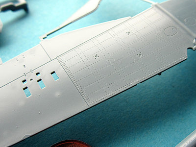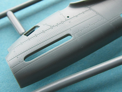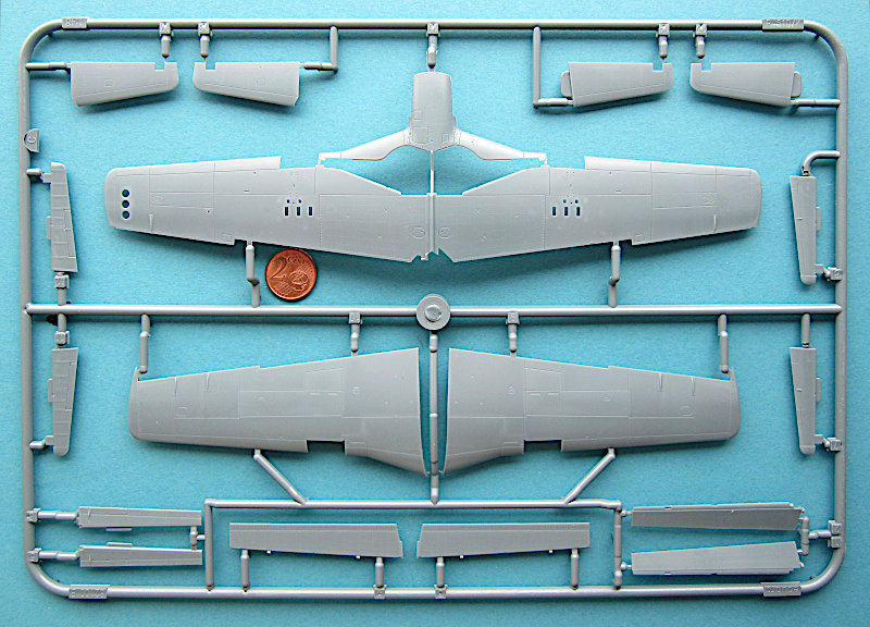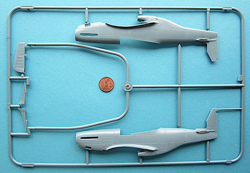 Fünf graue und ein klarer Gießrahmen finden sich in der Box. Es gibt einen separaten Rumpfspritzling und einen Flügelspritzling welche wohl je nach Version ausgetauscht werden. Hinzu kommen ein GFießrahmen für das Cockpit, einer für den Fahrwerksschacht und Anbauteile sowie zum Schluss ein Gießrahmen für externe Waffen und Tanks. Von letzterem fliegen schon ein paar Teile durch die Tüte, aber diese ist gut gepackt, so dass sich die Gießäste nicht gegenseitig beschädigen. Die letzten drei und der klare Giesrahmen werden sich wohl in jeder Mustang Edition von Eduard wieder finden. Der erste eindruck des Bausatzes ist sehr gut. Die Oberflächengestaltung entspricht der Tempest mit superfeinen Gravuren und Nietenreihen. Letztere findet man auf dem Flügel nur dort, wo diese nicht gespachtelt waren. Ich finde dies ist ein guter Kompromiss.