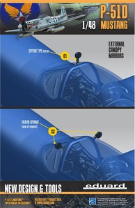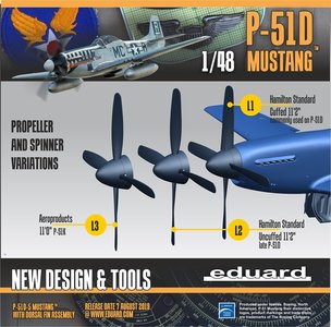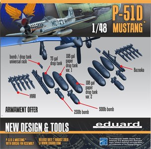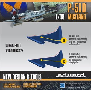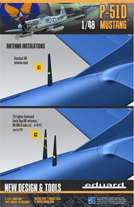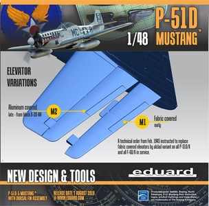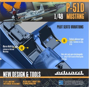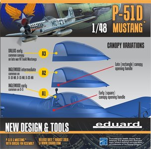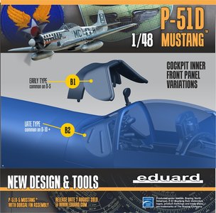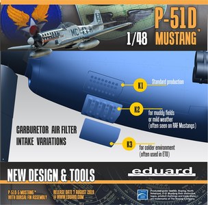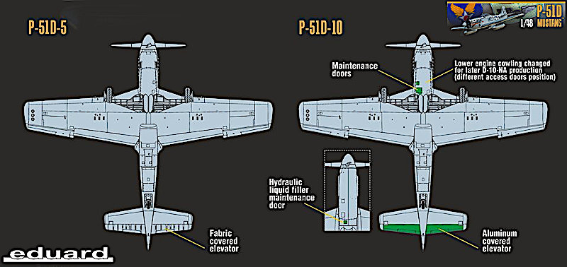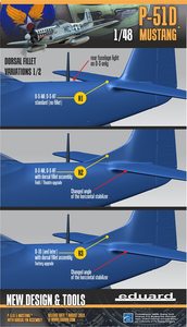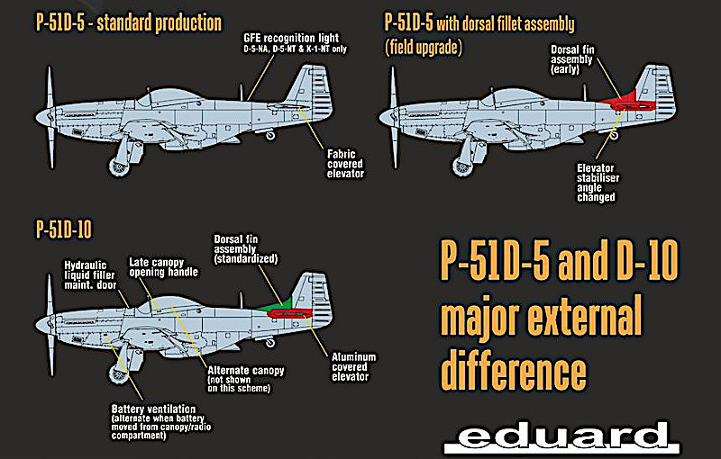 Bausatz: Nach Meng und Airfix bringt nun auch Eduard eine neue P-51D auf den Markt. Im Gegensatz zu den anderen beiden Herstellern beginnt die Firma aus Obrnice mit der frühen Version P-51D-5. Allerdings hat man sich passend zur Präsentation des Bausatzes bei den US IPMS Nationals in Chattanooga (Tennessee) für die Mustang "Chattanooga Choo Choo", eine P-51D-5 mit fin fillet, entschieden und die Limited Edition entsprechend benannt. Zu den unterschiedlichen Bausatzoptionen und verschiedenen zu erwartenden Versionen hat Eduard einige Grafiken erstellt, die ich hier zur besseren Verständnis (mit Erlaubnis von Eduard) anhänge. (zum Vergrößern anklicken)