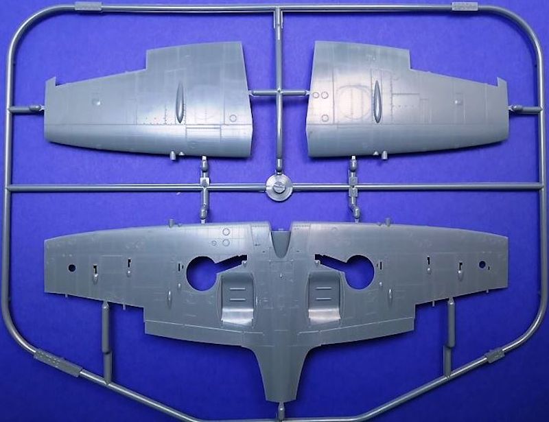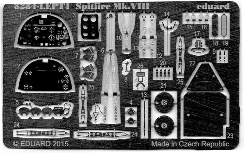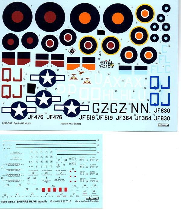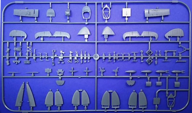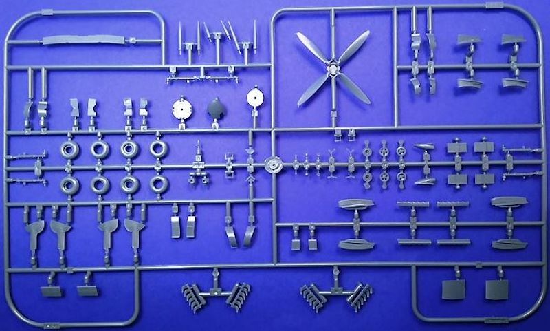 Bausatz: Zum Spitfire Mk.VIII-Kit hat Marco bereits einige interessante Anmerkungen gemacht. Wie bei Eduard üblich wurden hier versionsspezifische Rahmen mit den Teilen für Rumpf und Flügel samt den verlängerten Flügelenden mit den Standardrahmen für die Spitfire-Innereien kombiniert. Im stabilen Karton finden sich eine farbige 18-seitige Bauanleitung, rund 190 dunkelblaugraue Kunststoffteile an vier Rahmen, je zu zweit in wiederverschließbaren Tüten verpackt, 14 Klarsichtteile, ein Rahmen bedruckte Fotoätzteile und Eduards hauseigene Lackiermasken, letzteres alles in Clipsbeuteln. Die Qualität ist wie von den letzten Bausätzen her bekannt makellos, Sinkstellen und Grat fehlen gänzlich, Auswerfermarkierungen sind an Stellen gelegt worden, wo sie nach dem Bau unsichtbar bleiben.