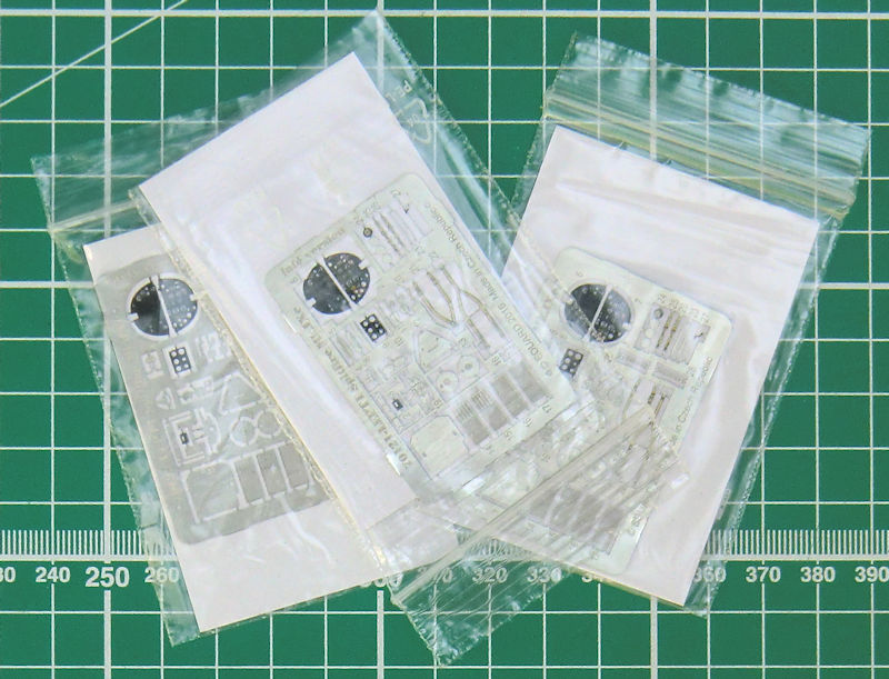 Der Bau beginnt mit dem sehr gut detaillierten Cockpit. Hier kann man die erhabenen Instrumente mit einem Decal versehen oder das Sandwich-Brett montieren. Die Rumpfinnenseiten haben auch schöne Strukturen. Natürlich liegen in dieser Edition auch die geätzten Sitzgurte bei. Alternativ kann die Einstiegsklappe offen bleiben. Bei der Ausstattung des Cockpits sind einige Unterschiede zu beachten. Man muss sich daher sehr früh für eine bestimmte Bemalungsvariante entscheiden.