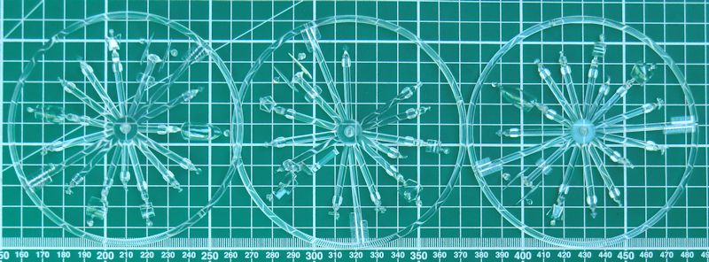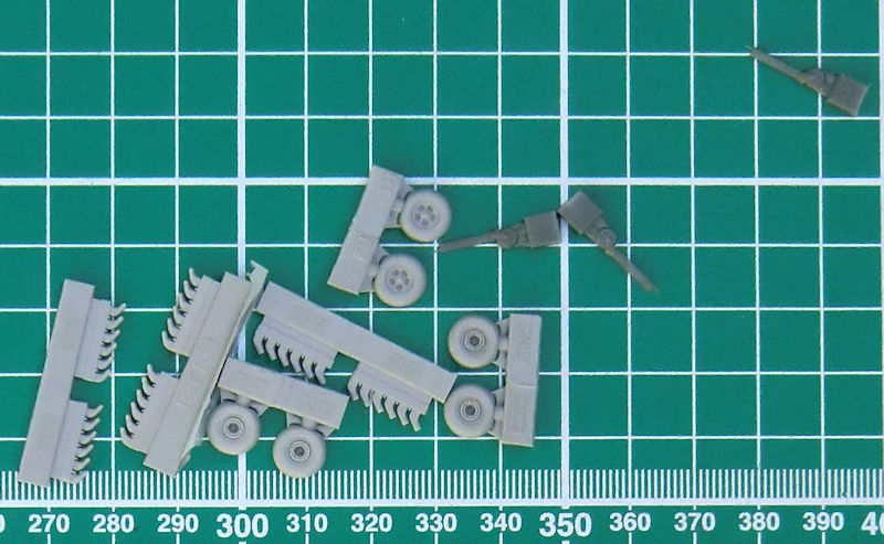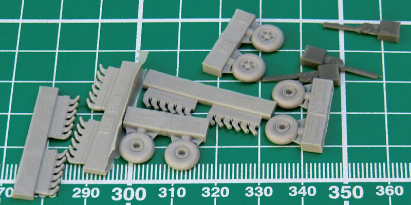 Bei den Spritzgussfelgen liefert eduard Alternativteile. Hier liegen aber zusätzlich drei verschiedene Resinrädersets bei. Die Luftschraube ist einteilig. Das erspart eine gewisse Fummelei. Der obligatorische Spiegel an der Frontverglasung darf nicht fehlen. Es gibt noch Bomben oder Zusatztanks, die man unter die Tragfläche hängen kann. Drei verschiedene Auspuffsets liegen aus Resin bei.