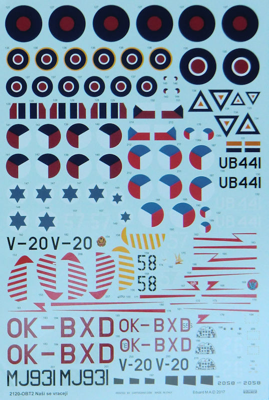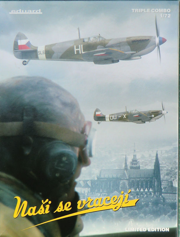 Bausatz: Hier hat eduard einen Bausatz für den tschechischen Markt herausgebracht. Aber dieser Kit dürfte auch genug internationale Kunden finden, denn es gibt unglaubliche 39(!) Bemalungsvarianten der Supermarine Spitfire Mk. IX in 1/72. In dem attraktiven Stülpkarton befinden sich 15 Spritzgussrahmen mit 498(!), drei klare Spritzlinge mit 45 Teilen, drei mehrfarbig bedruckte Fotoätzteile, drei Bögen gelbe Masken, 15 Resinteile, eine mehrfarbige Bauanleitung, die ausführliche Bemalungsanleitung und das 102-seitige Buch über die Vorbilder. Leider ist letzteres nur in Tschechisch, denn es gibt hier sehr tolle Bemalungen für diese kleine Spit! Weiterhin gibt es einen Briefumschlag samt Briefmarke zum Thema.