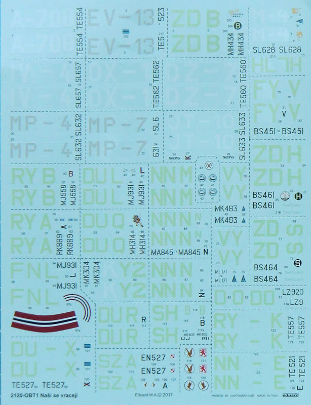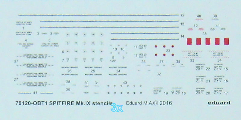 Die fünf Decalbögen sind tadellos im Register gedruckt. Drei davon sind jeweils die Bögen mit Wartungshinweisen. Diese sind auf weißem Trägerpapier gedruckt. Es gibt hier scheinbar jeden Wartungshinweis der Spitfire. Bei den Farbangaben bezieht man sich auf das System von Gunze.