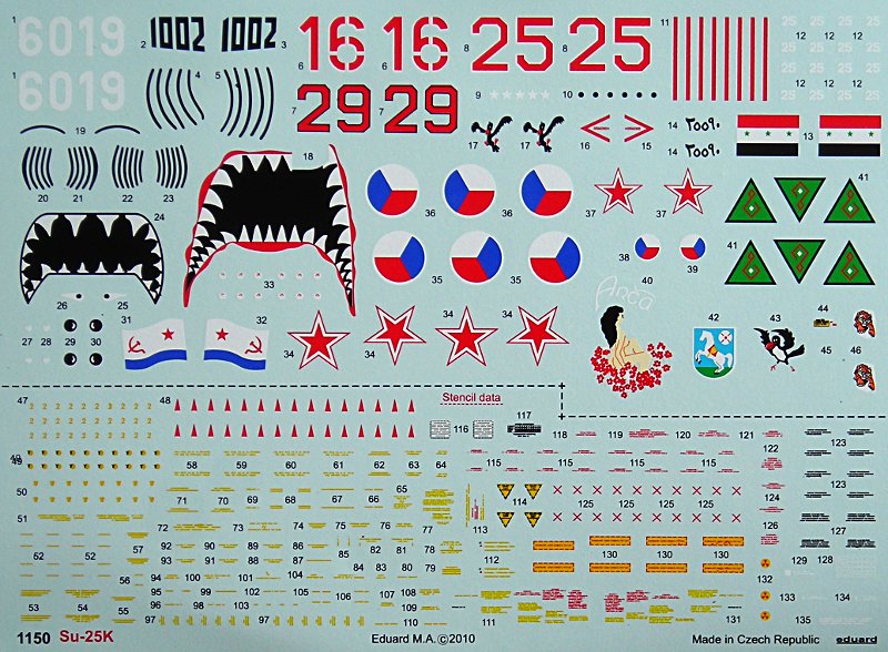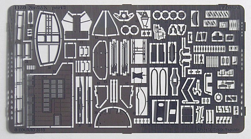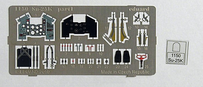 Bausatz: Wie zur Spielwarenmesse in Nürnberg angekündigt, veröffentlicht Eduard nach und nach die 1/48er Modelle von Kopro/OEZ. Nun ist also die Su-25 bzw. Su-25K dran. Nach meiner Meinung ist der Grundbausatz formtechnisch das schwächste Werkzeug der Reihe. Sämtliche Gravuren sind schwammig (auch schon in der ersten Edition im häßlichen blauen Karton von OEZ). Wenn ich mich recht entsinne erschien er in der Zeit des Zerfalls des RGW bzw. Warschauer Vertrages und somit in einer wirtschaftlichen Umbruchphase, woher vielleicht dieser Unterschied zu den anderen Formen liegt. Die ausgewaschenen Gravuren sind aber zumindest alle versenkt dargestellt. Weiterhin positiv zu erwähnen ist, dass die Su-25 gut getroffen ist und nicht ein Prototyp für den Formenbau herhalten musste (wie beim Monogram Modell).