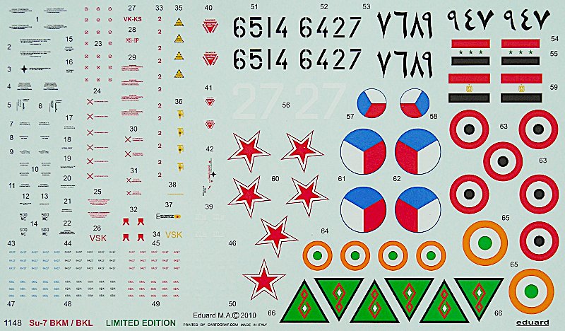Bei den Bemalungsvarianten hat sich Eduard für 5 getarnte Maschinen entschieden. Zwei tschechische und je eine in Diensten der Sowjetunion, Irak, Indiens und Ägyptens. Alles in allem sehr bunte Maschinen mit vielen interessanten Tarnschemata. Mich persönlich spricht die ägyptische mit Nil-Schema am meisten an. Die Decals sind wieder bei Cartograf hergestellt und von sehr guter Qualität!