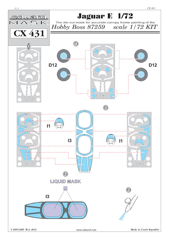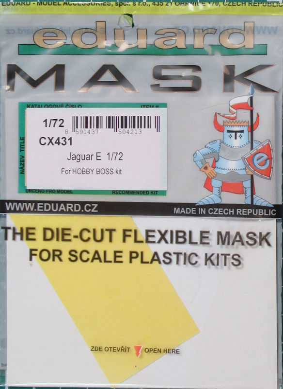 Für den Bausatz der Sepecat Jaguar E von HobbyBoss in 1/72 hat eduard ein Maskenset herausgebracht. Diese Maskenset enthält einen gelben Bogen für die Kanzel und die Fahrwerksräder des Bausatzes.