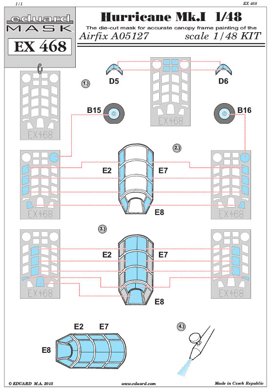 Bei Eduard ist es inzwischen zur guten Tradition geworde, für fast alle neuen Bausätze nach - mehr oder weniger - kurzer Zeit Zubehörsätze herauszubringen. Für die Hurricane von Airfix gibt es gleich eine ganze Reihe von Zubehörsätzen in verschiedenen Produktlinien. Dieser Maskensatz für Airfix' Hurrikane Mk.I (First Look) entspricht dem, was man so erwartetet. Die Passgenauigkeit der Masken ist bekanntlich sehr gut und mit diesem Satz kann man fast alle Klarteile und die Felgen abkleben. Fast, da die Positionslichter an den Flügelspitzen selbst abgeklebt werden müssen.