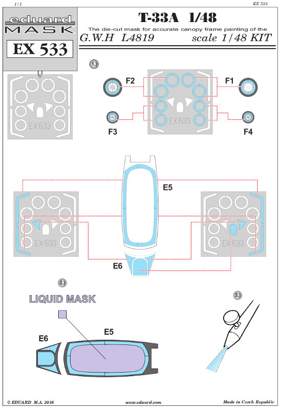 Für die 2016 erschienene Lockheed T-33A von Great Wall Hobby (First Look) hat Eduard einige Detailsätze herausgebracht. Wie fast zu jedem neuen Bausatz gibt es auch hier einen Maskensatz zum Abdecken der Klarteile für die Lackierung. Sehr umfangreich ist der Satz nicht. Es gibt ja auch nur 3 Scheiben des Windschutzes abzukleben und für die Blasenhaube sind wie immer nur die Randbegrenzungen enthalten. Diese passen aber meist sehr gut, so dass sie lediglich ausgefüllt werden müssen. Ich benutze sie zwar sehr selten, aber Eduard hat hier auch Abklebemasken für die Felgen beigefügt.