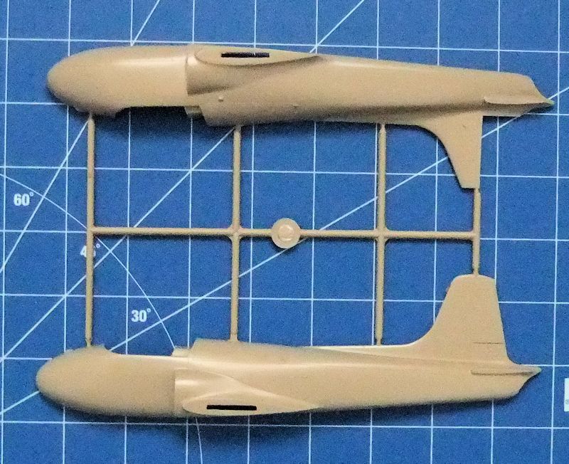 Trotz der fehlenden Passhilfen lassen sich die Hauptbauteile, also die Flugzeugzelle, gut zusammenfügen. Da Höhenleitwerk und die Außentanks stumpf verklebt werden sollen, wird hier sicherlich viel Nacharbeit erforderlich sein.