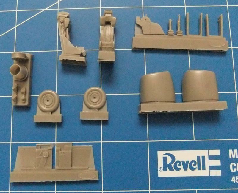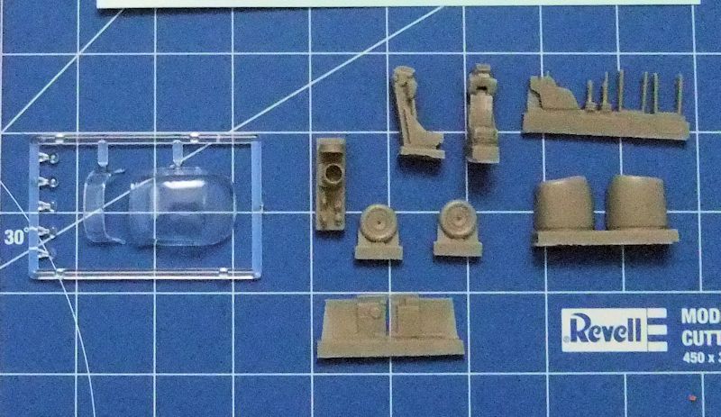 Alle im Short Run Verfahren hergestellten Teile sind sauber und ohne Grat oder Senkstellen produziert. Die negativen Gravuren präsentieren sich fein, durchgängig und sehr exakt. Bei den Schleudersitzen aus Resinmaterial könnten die aufgeprägten Sitzgurte etwas deutlicher sein. Die Seitenwände des Cockpits, ebenfalls aus Resin,fallen etwas mager aus. Bei einer geschlossenen Kabinenhaube dürfte die Cockpitsektion insgesamt aber ausreichend detailliert sein. Für die Instrumentierung des Armaturenbereichs sieht "Fly" ein schönes Decal vor. Ebenfalls aus Kunstharz bestehen die vorderen Lufteinläufe, die Räder, der Austritt der Düse sowie Steuerhebel und das mittlere Cockpitpanel mit einem Schubhebel.