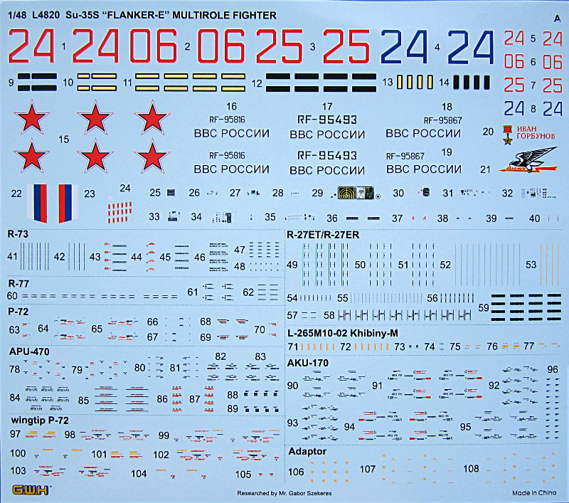 Kommen wir zu den Bemalungsvarianten. GWH sieht hier 4 Blau-grau getarnte Maschinen vor. Die Recherche dazu wurde von Gabor Szekeres beigesteuert, der Druck erfolgte in China. Trotzdem machen die Abziehbilder einen sehr guten ersten Eindruck, was Farben und Register angeht. Bei meinen Versuchen in der Vergangenheit haben sich chinesische Decals oft als steif und brüchig erwiesen, aber das bleibt abzuwarten.
