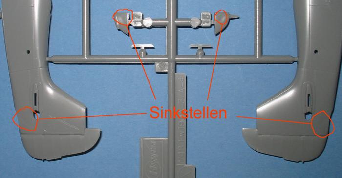 Einige Kritikpunkte: Der Absatz am Flügel-Rumpf Übergang ist wie bei Dragon recht ausgeprägt und es bleibt auch ein Spalt (das ergab jedenfalls die Probemontage ohne Cockpit). An den Teilen für die unterschiedlichen Seitenflossenspitzen (für die Antennenaufnahme) sind leichte(!) Sinkstellen zu erkennen. Ebenso am Rumpfheck, wo sich innen die Aufnahme für das Spornrad befindet. Der meiner Ansicht nach schwächste Punkt ist das einteilige Spornradfederbeinkonglomerat. Puristen sollten hier für Ersatz sorgen.