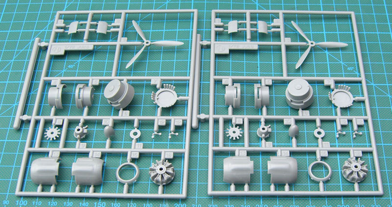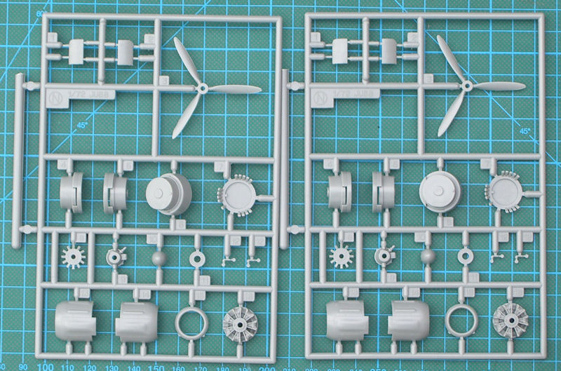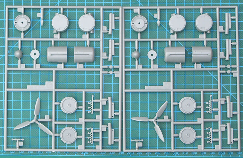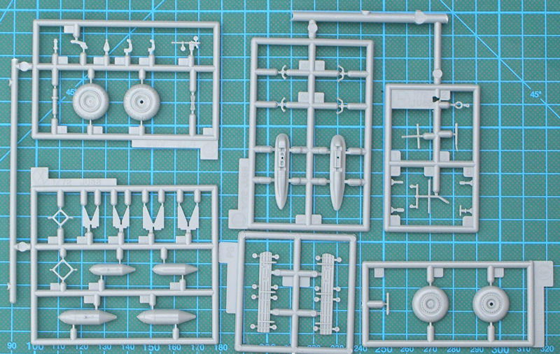 Durch den Variantenmix muss man wieder ein wenig bei der Montage der Bauteile aufpassen. Ausreichende Abwurfwaffen liegen bei. Die beiden Luftschrauben-Typen sind ordentlich getroffen. Wenn man diese mit denen aus dem Italeri-Bausatz vergleicht, dann wird der Form- und Qualitätsunterschied deutlich.