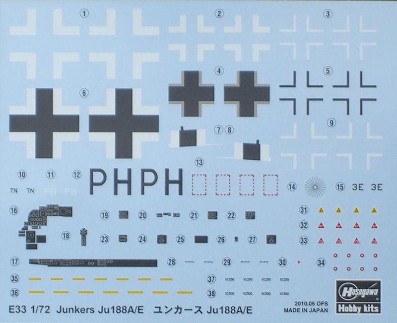 Bausatz: Lange Jahre gab es zwei Bausätze der Ju 188A/E im Maßstab 1/72. Beide Kits von Italeri und Matchbox waren Kinder der 70er Jahre mit allen Vor- und Nachteilen. Seit einiger Zeit hat Hasegawa die 88-Reihe im Visier und man konnte hoffen, dass auch die Ju 188-Reihe einmal Berücksichtigung findet. 2010 ist es nun endlich soweit!