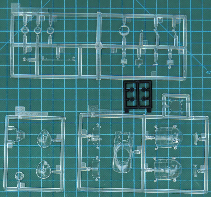 Bausatz: Hierbei handelt es sich um einen limitierten Bausatz, der nur leider kurze Zeit am Markt verfügbar ist. Die hier gemachten Aussagen gelten natürlich auch für andere Variationen der Ju 188 von Hasegawa Der stabile Stülpkarton ist randvoll mit Bauteilen. Es sind 17 graue z.T. sehr kleine Spritzrahmen mit 129 Spritzgussteilen, drei Klarsichtrahmen mit 24 Teilen, vier schwarze Kunststoffclips, die Bauanleitung und der Decalbogen. Eine Vielzahl von Teilen ist für andere Versionen der Ju 88/188 bestimmt und wandert in die Restekiste.