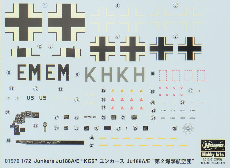Die Bemalungsanleitung ist sehr ordentlich und Hasegawa liefert für die Skizzen auch den Maßstab der Verkleinerung mit. Die Decals sind tadellos und ohne Versatz gedruckt. Das Weiß hat - wie bei Hasegawa üblich - einen leichten Gelbstich. Ich finde es für ein Militärflugzeug wie die Junkers Ju 188 passend.