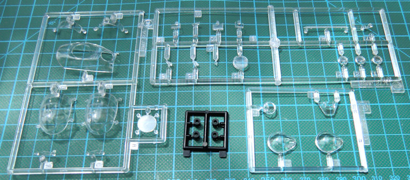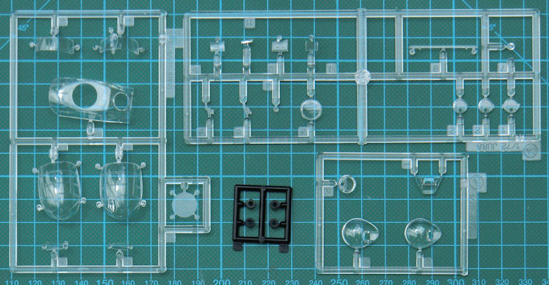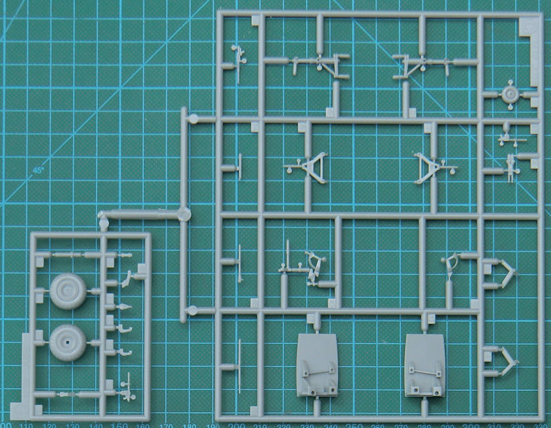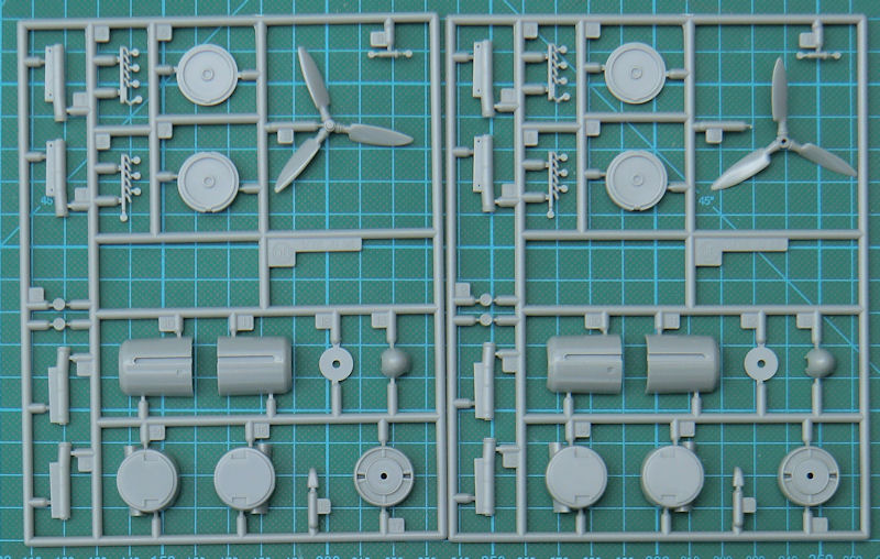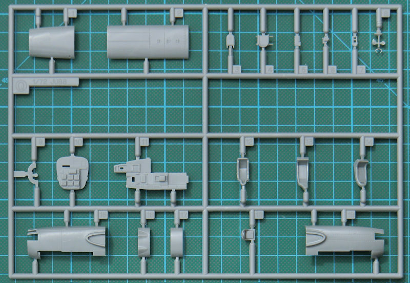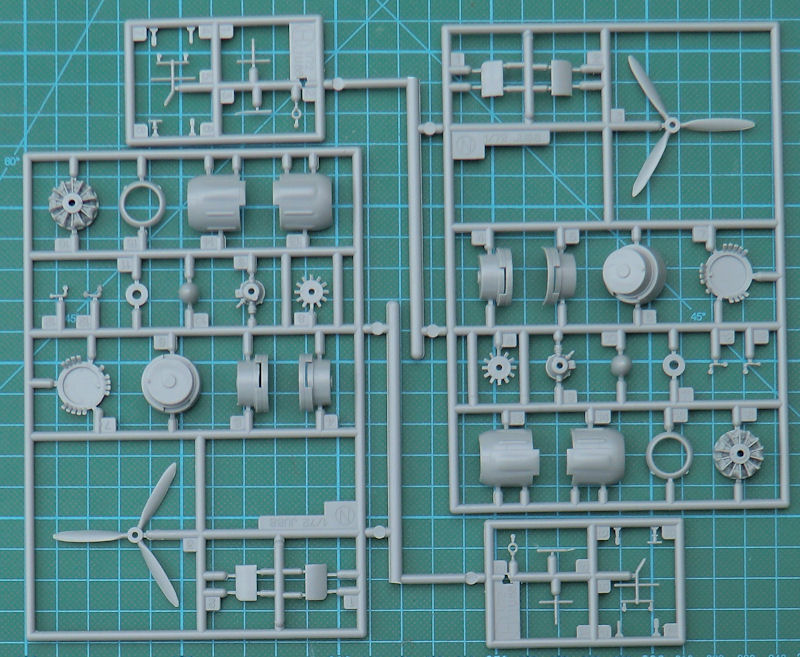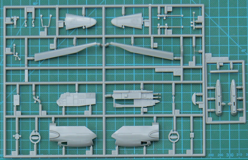 Bausatz: Hierbei handelt es sich um einen limitierten Bausatz, der nur kurze Zeit am Markt verfügbar ist. Der stabile Stülpkarton von Hasegawa ist randvoll mit Bauteilen. Es sind 17 graue z.T. sehr kleine Spritzrahmen mit 129 Spritzgussteilen, drei Klarsichtrahmen mit 24 Teilen, vier Zinnteile, eine kleine Fotoätzplatine, die Bauanleitung und der Decalbogen. Eine Vielzahl von Teilen ist für andere Versionen bestimmt und wandert in die Restekiste. So gibt es die kompletten Motorsektionen mit Luftschrauben für die E-Version.