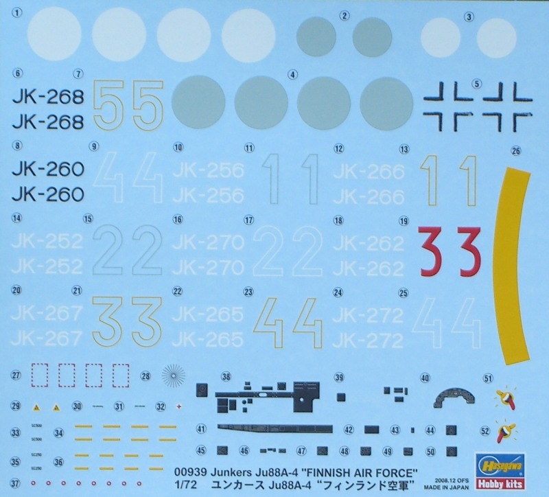 Bausatz: Der vor einigen Jahren bei Hasegawa erschiene Bausatz der Junkers Ju 88 ist nach wie vor in 1/72 das Maß aller Dinge. So verwundert es auch nicht, dass nach und nach verschiedene Versionen oder Decalvarianten herauskommen. Hier haben wir es mit letzterem zu tun. Der große zweiteilige Karton enthält die bekannten Teile. Die einzige Schwäche ist das mäßig detaillierte Cockpit. Wer hier Abhilfe haben möchte, der kann sich bei den Kleinserienherstellern austoben und dort sein Geld lassen. Wer aber einfach mal ein Modell aus der Kiste bauen möchte, der wird auch hier zufrieden gestellt.