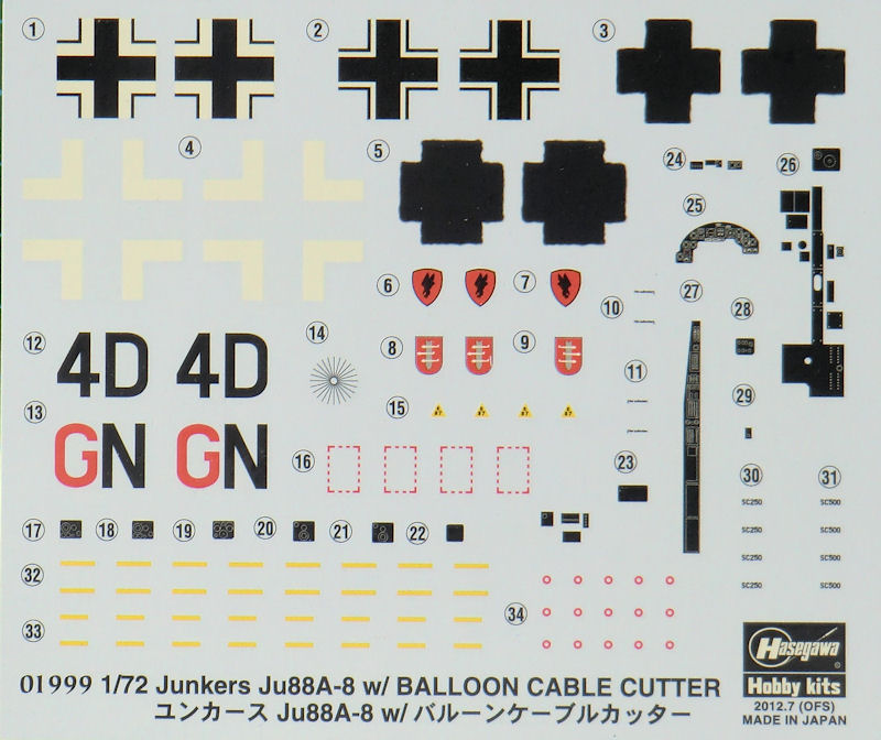 Bausatz: Hasegawa bringt den gelungenen Bausatz der Junkers Ju 88 in 1/72 in immer neuen Versionen heraus. So gibt es hier nach der zurückgerüsteten A-6 nun auch die A-8 mit Kutonase in einer limitierten Version. Im stabilen praktischen Stülpkarton bedinden sich gut verpackt 19 z.T. sehr kleine graue Spritzlinge mit 99 Teilen, ein paar Klarsichtrahmen mit 21 Teilen, einen großen Fotoätzteilbogen, die Klipps für die Propeller, die Vorbildinformationen auf Japanisch, einen Decalbogen und die übersichtliche Bauanleitung.
