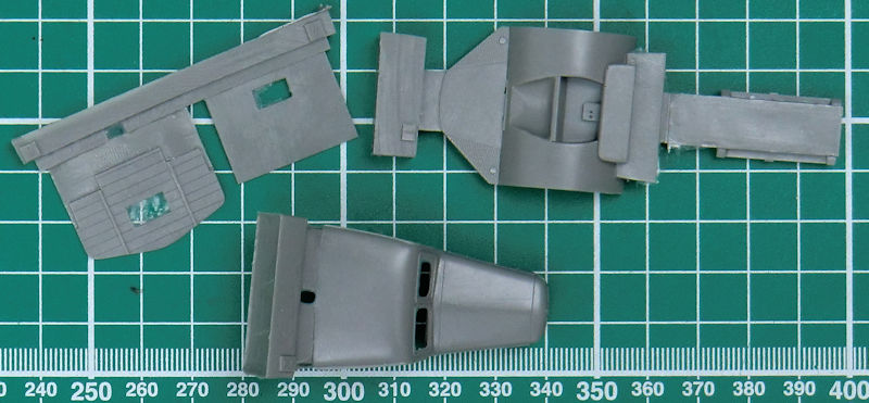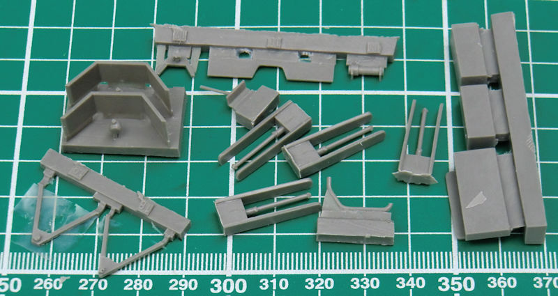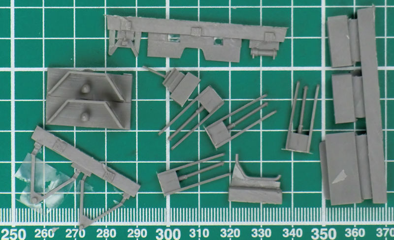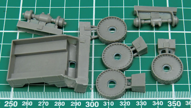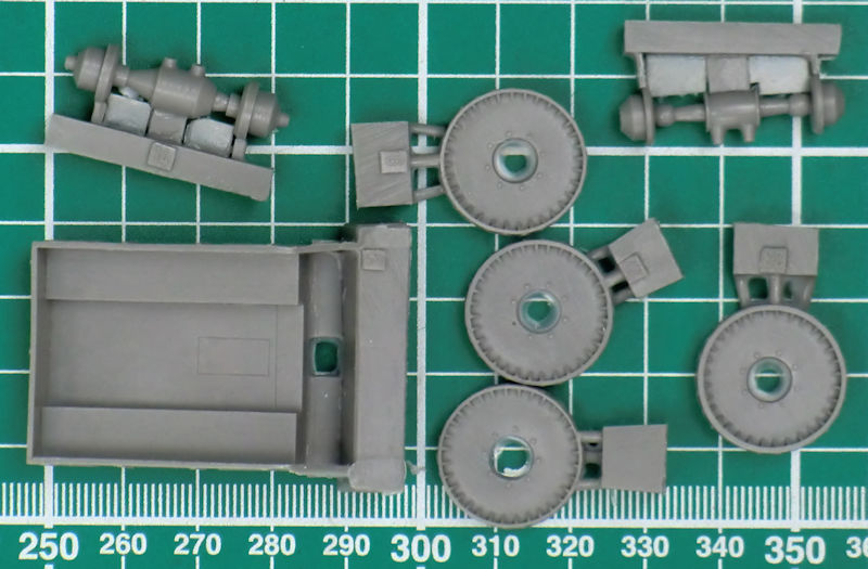 Die Resinteile sind sauber gegossen. Blasen gibt es keine und die Angüsse sind sinnvoll gelegt. Der Bau beginnt mit dem Fahrgestell und von unten sind Motor- und Getriebe angedeutet. Unter der großen Motorhaube bleibt es leer. Die Pritsche des Radschleppers kann mit Spriegel aus geätztem Metall hergestellt werden.
