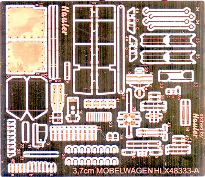 Die meisten Teile des Bogens A dienen der Verfeinerung der Panzer IV Oberwanne. Insbesondere Werkzeughalterungen halten den Modellbauer hier auf Trab. Jedoch gibt es auch einige Details für die Bordwände und die Flak 43 selbst. Hier sticht natürlich das Gitter für den Hülsenfangkorb hervor.