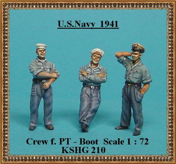 Bei KSHG 210 handelt es sich um ein Set dreier 'Sailors' im blauen Arbeitszeug. Gedacht sind die Figuren für ein PT-Boot. Mit Blick auf das Anfang 2006 erscheinende Gato-Class Unterseeboot von Revell/Monogram USA erweitert sich der Einsatzbereich dieser Figuren natürlich. Man könnte die Figuren auch auf einer in warmen Gewässern eingesetzten Flower-Class Korvette der US-Navy einsetzen.