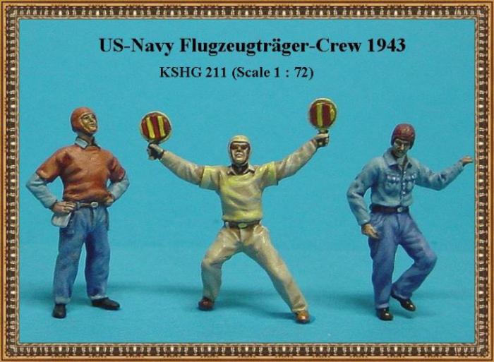 KSHG 211 versorgt den Modellbauer mit drei Figuren für den Einsatz auf einem US-Trägerdeck. Alle drei tragen die üblichen Kopfhauben. Zwei die dünnen Shirts zum Überstreifen, die, in verschiedenen Farben gehalten, die jeweilige Aufgabe des Betreffenden kennzeichneten.