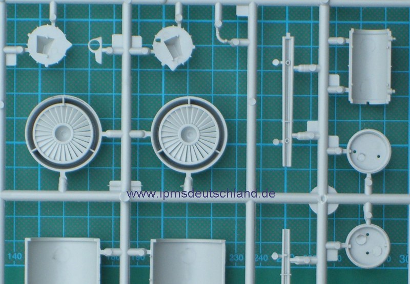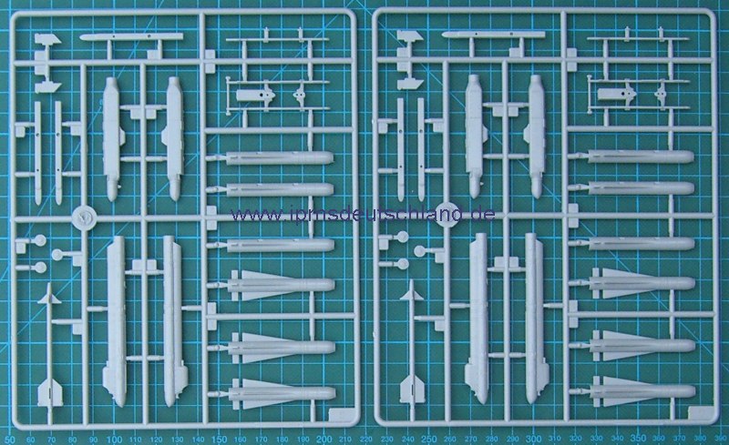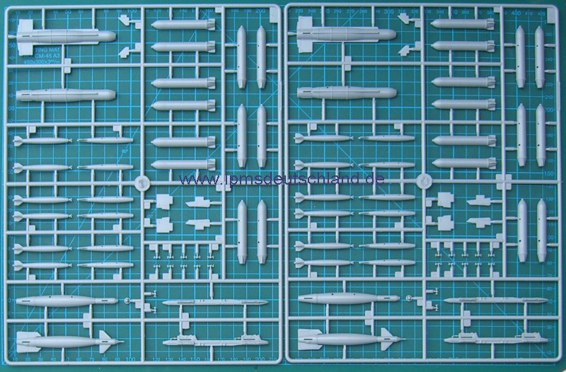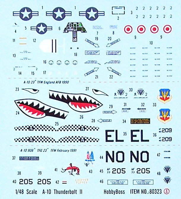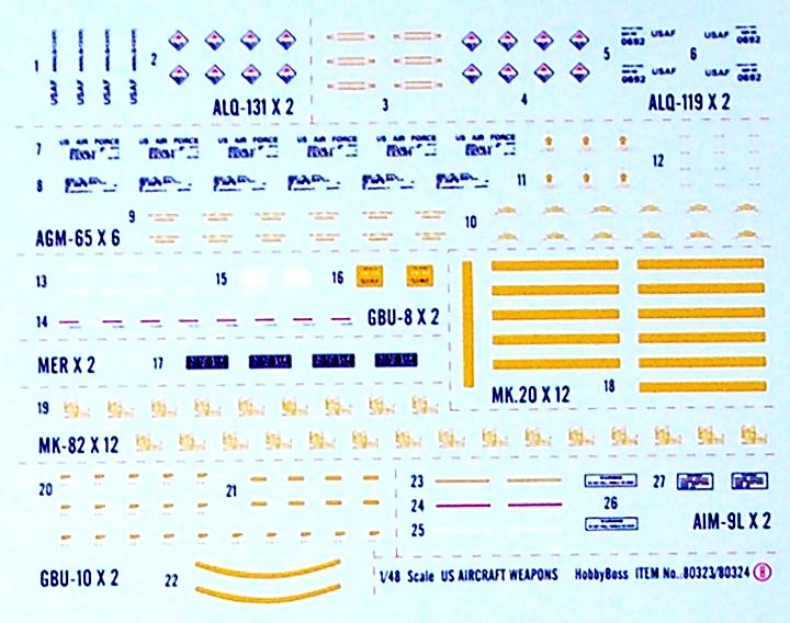 Es gibt Sachen, die sind einfach toll gemacht. Die Triebwerksschaufeln sind durchbrochen, die Einstiegsleiter kann ausgefahren gebaut werden und HOBBYBOSS hat auch die Vorlegkeile nebst Schnurr nicht vergessen. Die Bewaffnung würden andere Hersteller separat in ein Waffenset legen. Es gibt AGM-65, AIM-9L, GBU-8, MK-20, MK-82, ALQ-119, ALQ-131 und natürlich auch den großen Zusatztank. Eine Tabelle zeigt wie die Bewaffnung kombiniert wird. Beide Decalbögen sind separat verpackt und ohne Versatz gedruckt.