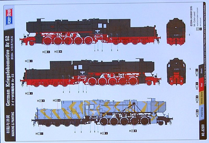 Ungewöhnlich ist schon die Vorbildauswahl der BR 52 mit Steifrahmentender und Holzwindleitblechen. Letztere waren wohl mehr ein Frontumbau als eine Serienproduktion. Die Nummern scheinen auch nicht korrekt zu sein. Die getarnte 52 8139 müsste eigentlich zu einer Reko-Lok der DR nach dem Krieg gehören. Eine Tarnung ist natürlich möglich. Das rote Fahrgestell und das schwarze Oberteil der 52 2495 passen zu einer Nachkriegslok. Ich bin aber derzeit noch auf der Suche nach weiteren Referenzen?