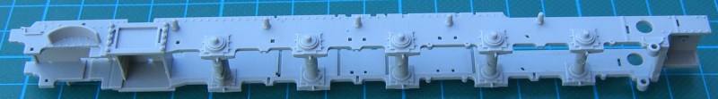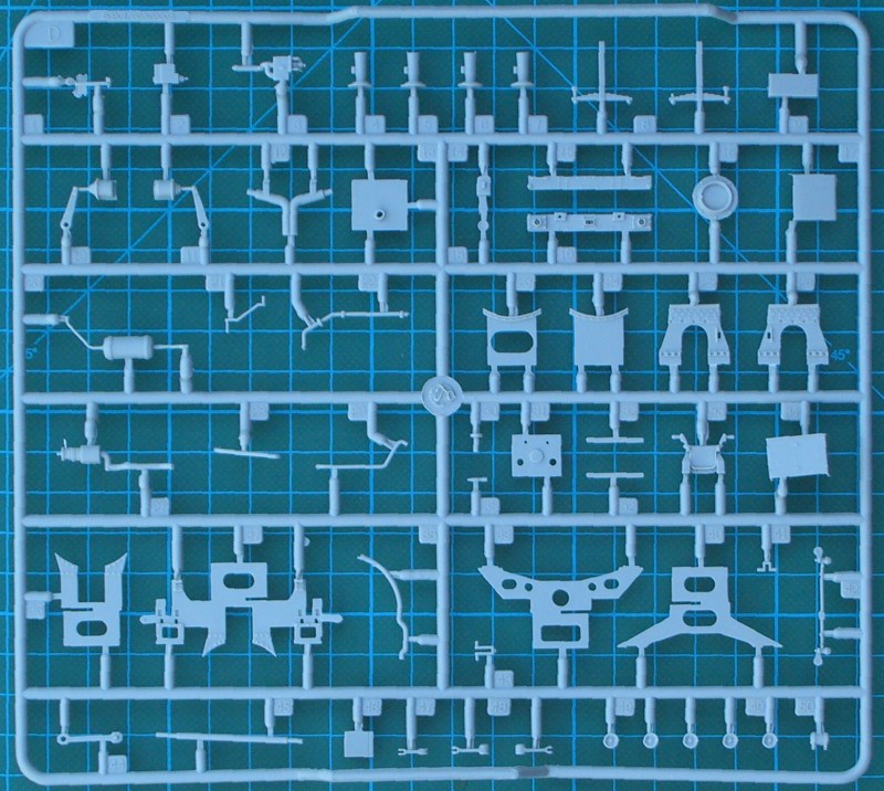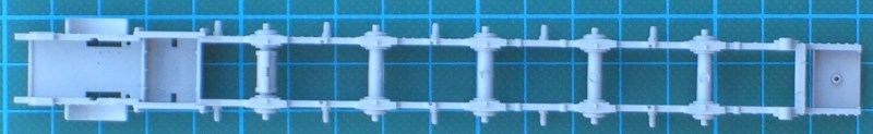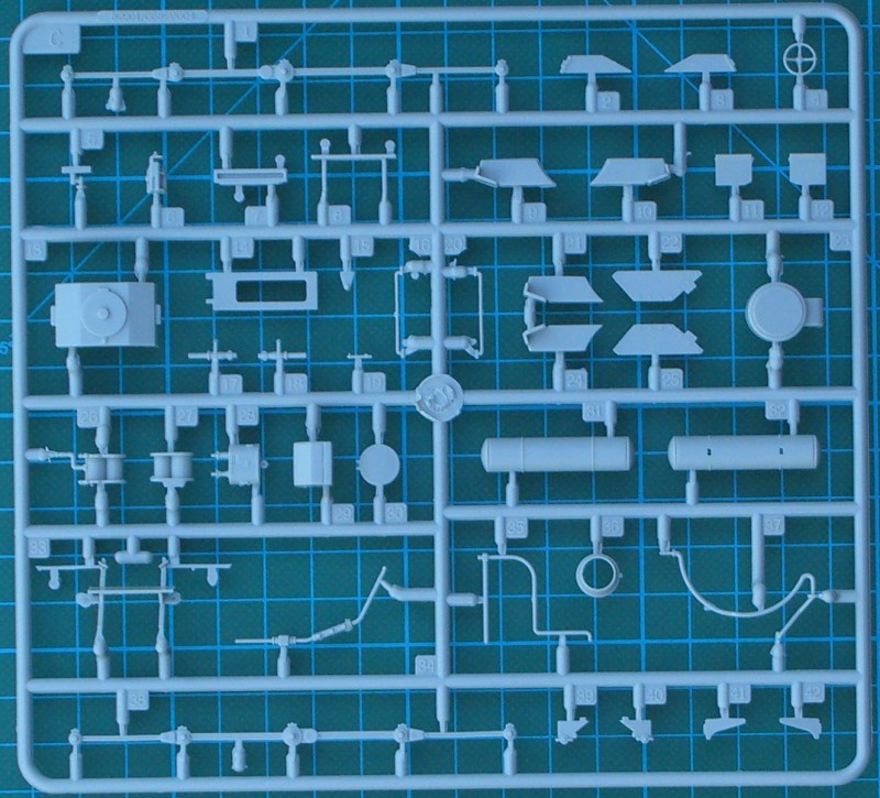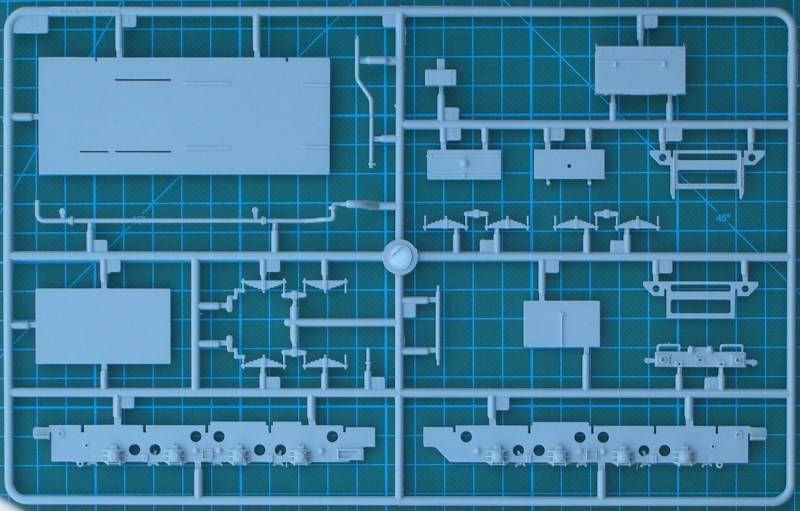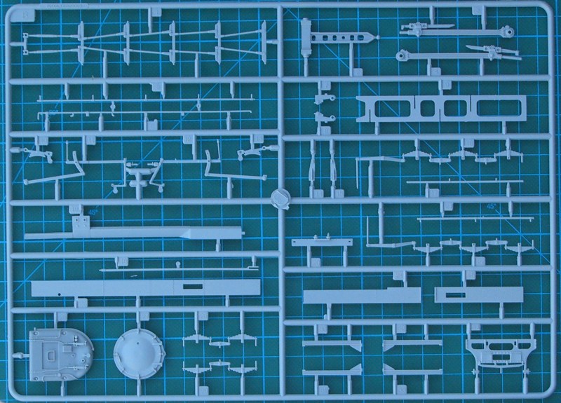 Der riesige Karton hält den Erwartungen stand. Es gibt sieben Spritzgussrahmen, zwei größere Spritzgussteile (Rahmen und Tendergehäuse), ein paar Klarsichtteile sowie Vinylteile für die Leitungen. Alle Teile besitzen eine sehr gute Detaillierung. Ein Teil davon ist sicher hinterher kaum noch sichtbar. Der Bau beginnt mit dem Fahrgestell und hier hat HobbyBoss einen ordentlichen Job gemacht. Details satt!!! Das Gleiche gilt für das Führerhaus. Durch die kleinen Fenster ist leider davon sehr wenig zu sehen. Allein das zu wissen, dass da was ist macht das Modellbauerherz glücklich.