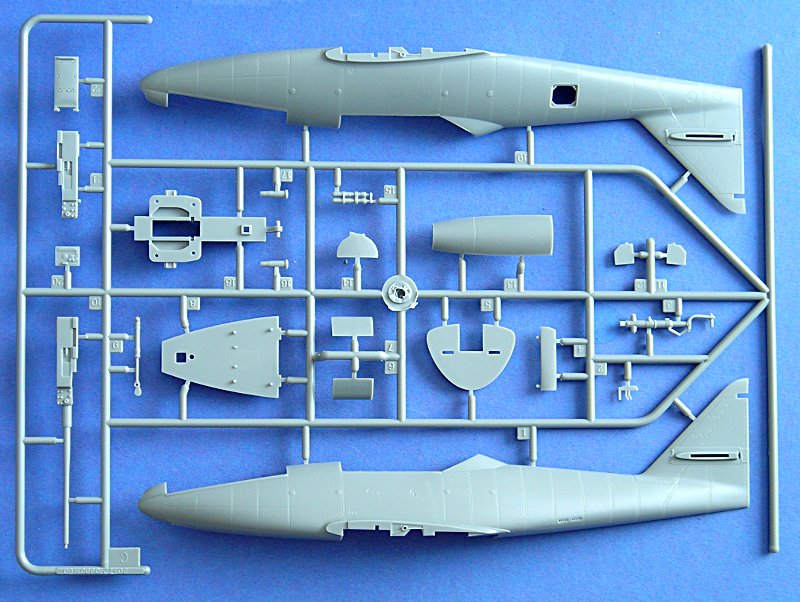 Im ersten Anschein erinnert das Modell an die Tamiyaform, wobei mir von einem befreundeten Modellbauer versichert worden ist, dass das Modell eher vom 1/32er Trumpeterkit abstammt. Hier ist auch die Kabinenhaube wesentlich besser getroffen als von Japans Premiummarke. Die einzige seltsame Formgebung betrifft den Rumpf vor und hinter dem Fahrwerksschacht. Nicht nur nach meiner Meinung sollte der Rumpf hier eher flach und nicht so stark konkav sein. Dies ist aber schwer auf den Vorbildfotos zu erkennen und auch am Modell werden die Triebwerksgondeln meist den Blick verwehren.