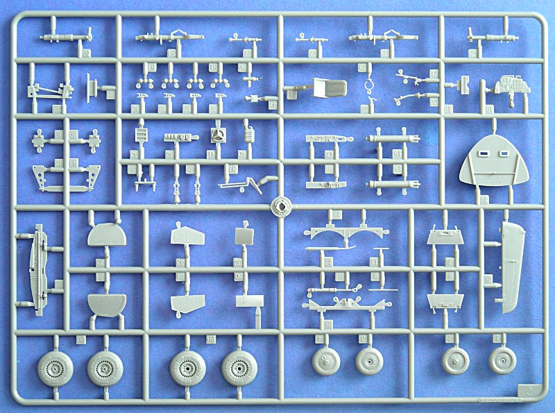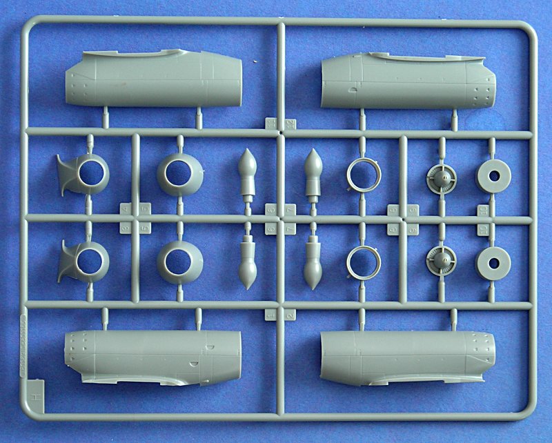 Bausatz: Der stabile Stülp-Karton enthält 5 graue und zwei klare Spritzlinge mit sehr schön gravierten und detaillierten Teilen zum Bau einer Me 262A-1 U/4. Die Gravur wird einigen etwas zu stark erscheinen, aber mir gefällt sie so ganz gut und sie ist randscharf ausgeführt. Einige Details sind etwas übermäßig hervorgehoben (z.B. die je 4 erhabenen Produktionshilfen rechts und links am Rumpf). Auch die Nietenreihen werden wohl nicht jeden begeistern können, ich finde sie allerdings noch im Rahmen. Der Rumpf ist auch von innen strukturiert und die Wartungsklappe ist geöffnet und liegt separat bei.