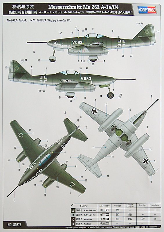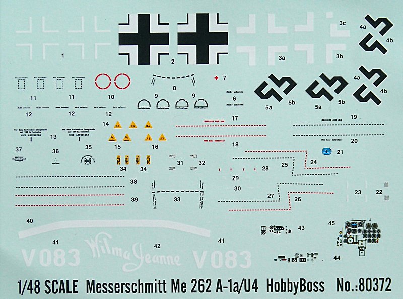 Die Abziehbilder sind typisch chinesisch und lassen optisch nichts zu wünschen übrig … die Verarbeitung war aber bisher bei meinen Versuchen immer anspruchsvoll. Nur eine Bemalungsvariante ist angegeben. Diese ist mit „Happy Hunter II“ betitelt. Der Bausatz enthält aber nur Markierungen für „Wilma Jeanne“. Daraus lässt sich natürlich auch die deutsche Maschine ohne „Kosenamen“ bauen. Die W.Nr. 111899 hatte offenbar keine Markierungen (jedenfalls habe ich dazu bisher keine Informationen gefunden), was wegen der Abgabe an den JV 44 zur Einsatzerprobung schon etwas seltsam ist. Mit der noch unbemalten, gespachtelten Nase macht diese Version aber schon etwas her (siehe Smith Creek und für den Lebenslauf der Maschine: „Me 262 Production Log“).