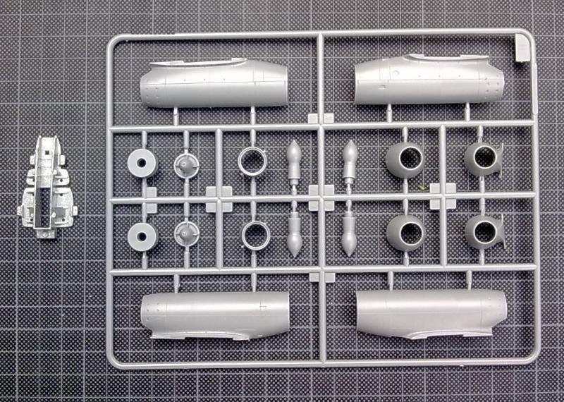 Die Bewaffnung besteht wie zu erwarten aus sechs MK 108, von denen vier an der üblichen Stelle Position und zwei in die Rumpfspitze einzubauen sind. Für letztere liegt eine Bugnase mit zwei Öffnungen bei. Ebenfalls vorhanden ist aber auch die obere Rumpfabdeckung mit nur zwei Öffnungen und vor allem eine geschlossene Bugkappe. Somit ist es möglich, eine „normale“ Me 262 A1a zu bauen indem man die geschlossene Nase aufsetzt und die zwei vorderen Waffen fortlässt.