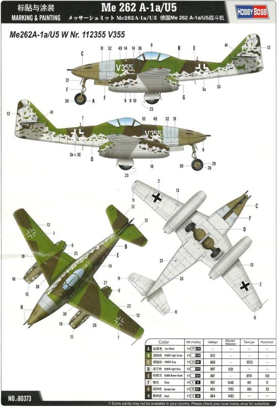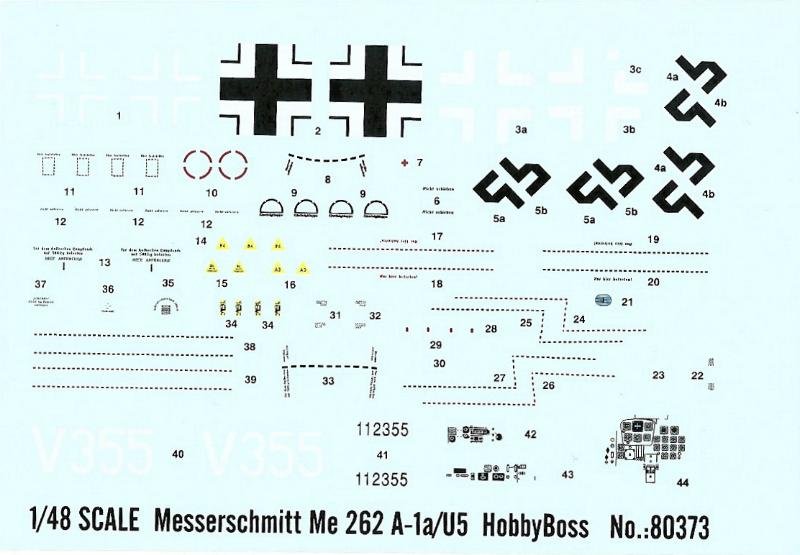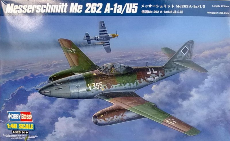 Hobby Boss legt in seiner Me 262-Serie hier die V355 vor, die als Prototyp der Me 262 A1a /U5 Interzeptor I (Projektbaubeschreibung vom 10.08.43) gelten kann, und mit sechs statt vier Mk 108 im Bug ausgerüstet war. Nur ein Exemplar wurde mit dieser Bewaffnung ausgerüstet. Ob dieses zum Einsatz kam und mit welchem Erfolg weiß ich nicht. Leider gibt Hobby Boss auch keine historischen Hinweise zu dieser Maschine.