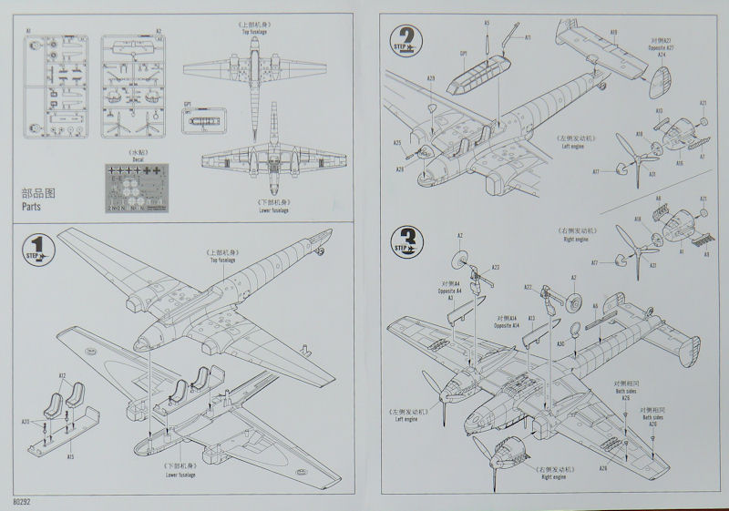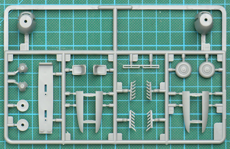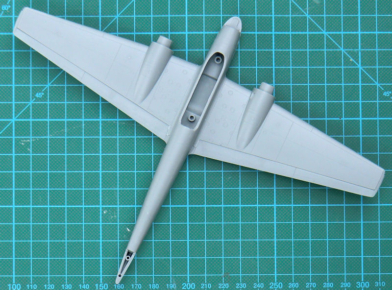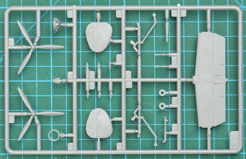 Der Rumpfbug ist komplett daneben und das ist kaum zu beheben. Dafür sind die beiden Großbauteile recht gut zu verbinden. Hier gibt es nur einen kleinen Spalt am Hinterrumpf. Das Spornrad ist anmodelliert. Die beiden Luftschrauben wirken etwas unterdimensioniert. Bei den Lufteinläufen unter den Motoren wirkt es auch so. Es gibt zwar ETC's aber keine Bomben oder ähnliches dafür. Das Hauptfahrwerk ist für Anfänger vereinfacht.