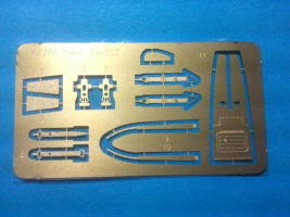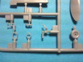 Das Instrumentenbrett ist mit erhabenen Details versehen, alternativ bietet der Decalbogen hierfür sowie für die Seitenkonsolen Instrumente. Die Räder sind zweiteilig und nicht abgeplattet. Für den offenen Fahrwerksschacht findet sich eine Nachbildung der hinteren Motorhälfte. Ein kleiner Rahmen mit 11 Ätzteilen für Gurte und Haube liegt ebenfalls bei.